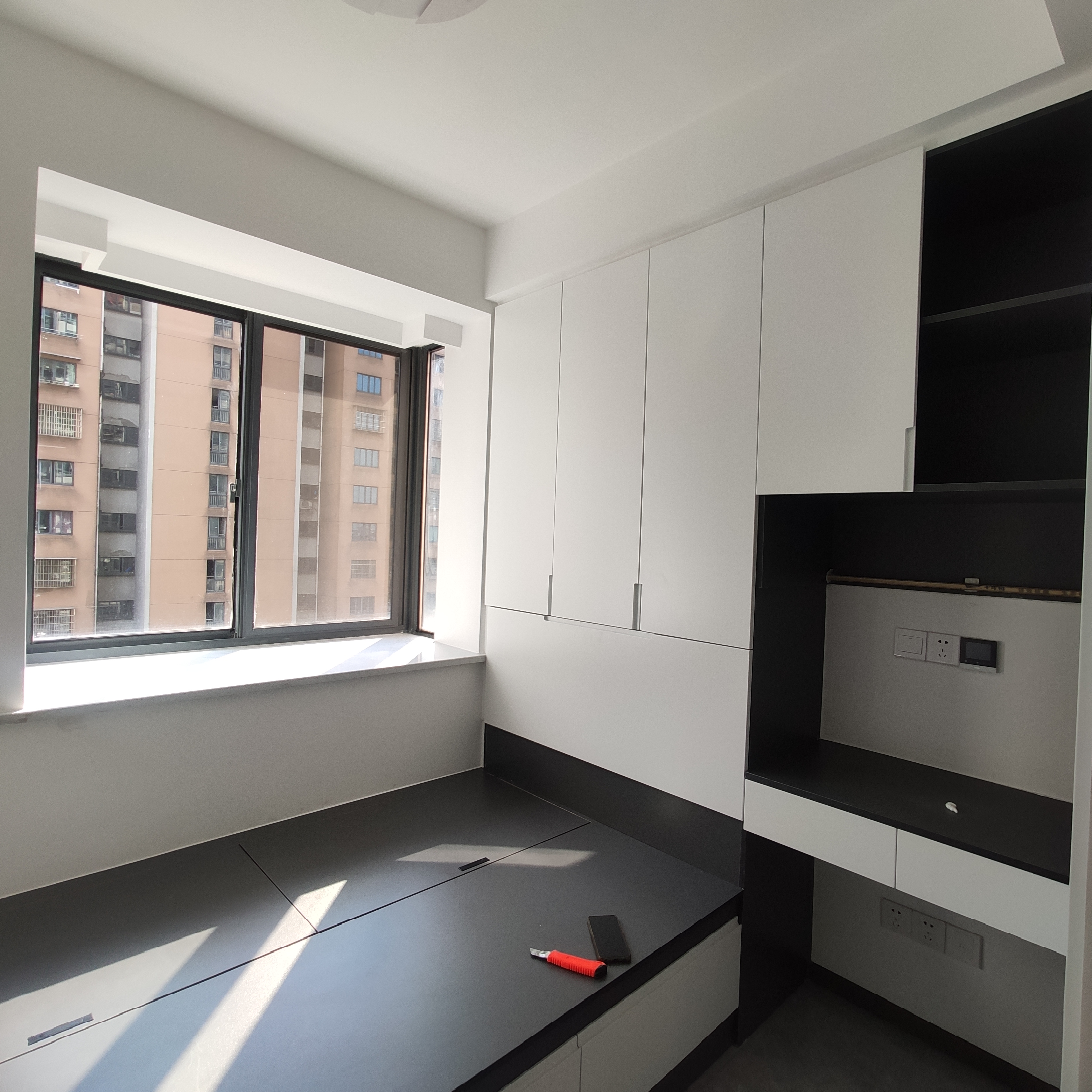 东城阳光竣工的一套,木工打的榻榻米加书桌加衣柜一体。