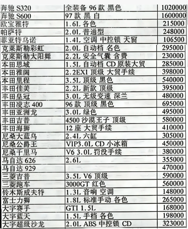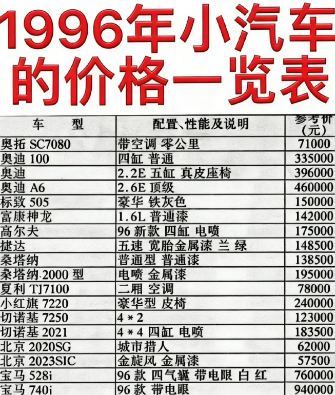 1996年的主流汽车价格