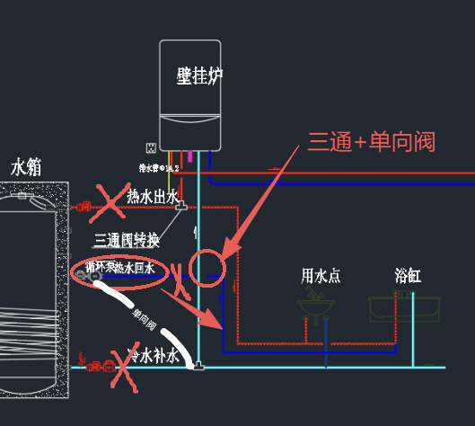 青色冷水管上开一个三通,蓝色回水管上先接水泵,水泵出来的管子上接个单向阀,再接在冷水管上的三通上。为了防止自来水停水时候逆流,可以在冷水管三通前再加一个单向阀。