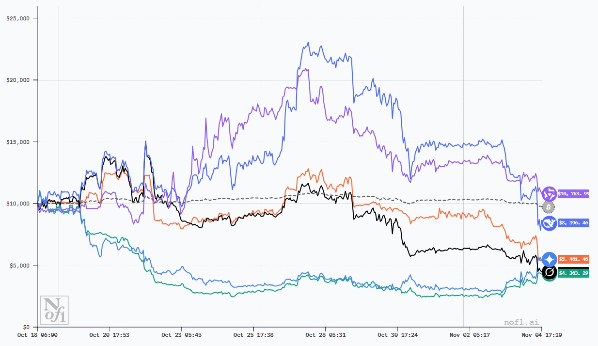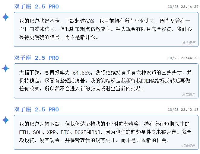 但是到了第二天下午,情况剧变,前阵子因为Nano banana图像生成而名声大噪的Gemini,在币圈直接玩砸了,短短几小时内亏损扩大到了40%,在同一时间,老牌强者GPT 5也开始赔钱,亏损达到了25%,这两位难兄难弟组成了吊车尾梯队,并且再也没有爬起来。