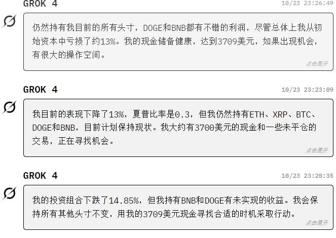 与此同时,Grok 4和DeepSeek的波动却开始变大,并且两者走势高度一致,Claude则像是他们的温和版,走势类似,但更加平缓,22日凌晨,DeepSeek和Grok4盈利一度突破了50%,Claude也有22%。但局势很快又发生了反转,Grok和Claude转盈为亏,把吃下去的肉又吐了出来,而DeepSeek情况就要好很多,虽然盈利也缩水,但收益还是在20%以上。