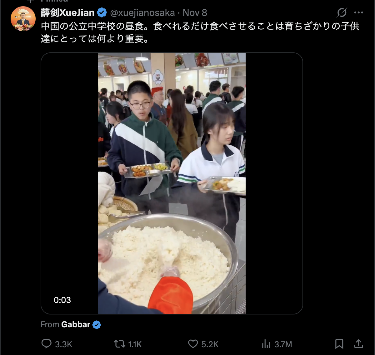 【2】中日在推上对线了一阵儿以后,驻大阪总领事薛总领把中国高中生拿餐盘㧟饭的视频置顶了