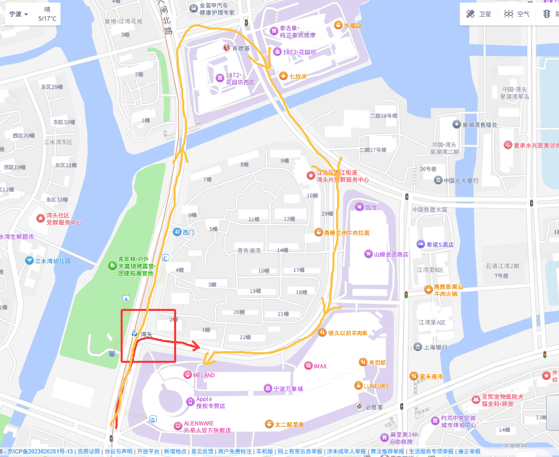 他们说的应该是方框处的路口,这里周末繁忙时间是不能右转的(红线),要按橙色线走。不繁忙可以按红线走
