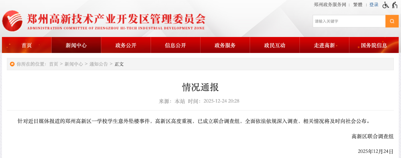 针对近日媒体报道的郑州高新区一学校学生意外坠楼事件,高新区高度重视,已成立联合调查组,全面依法依规深入调查,相关情况将及时向社会公布。