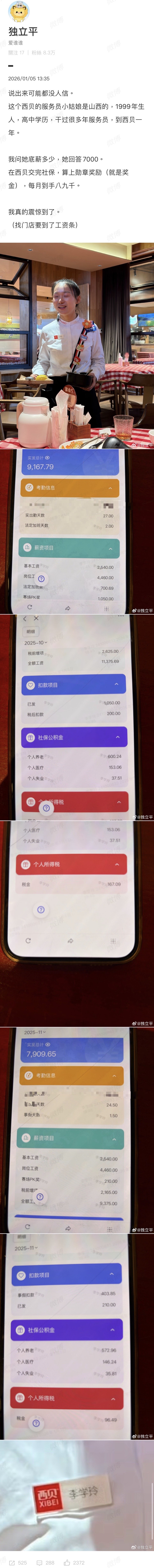 进微博原文看了下,此博主连发了几条关于西贝高工资的事,目前上热搜了。