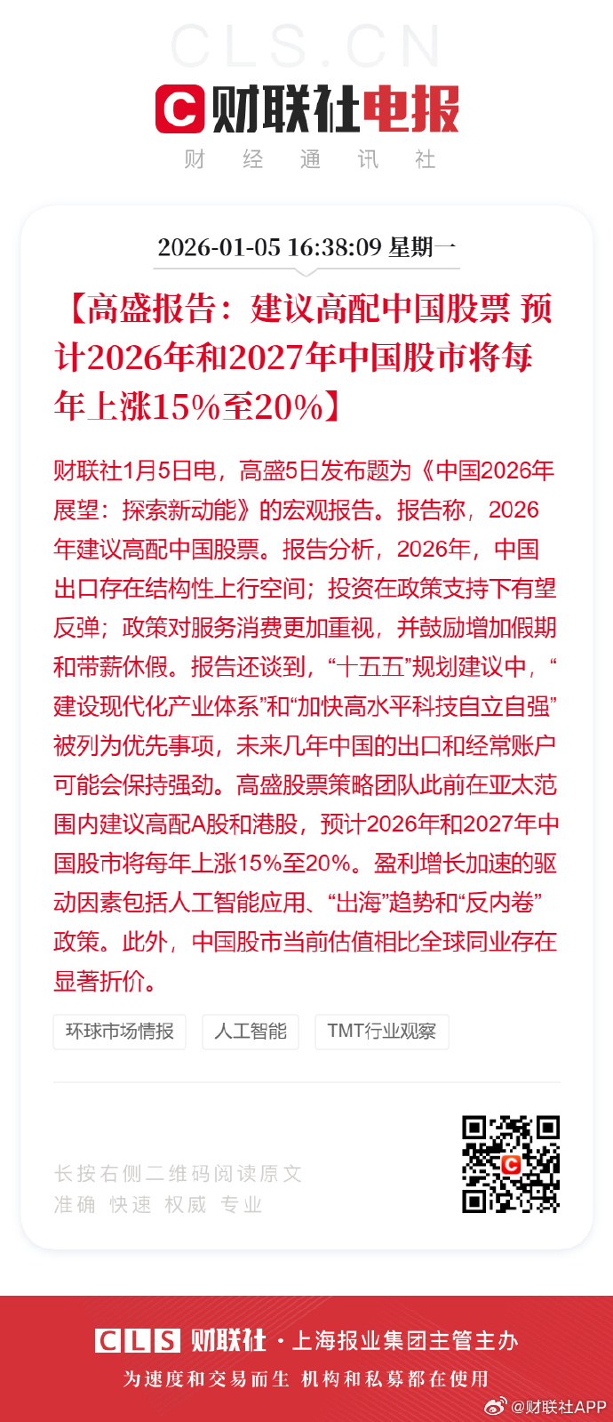 高盛:预计2026中国股市上涨15%,2027中国股市上涨20%。2027年如何我先不判断,但2026年我认为涨15%的预测太保守了