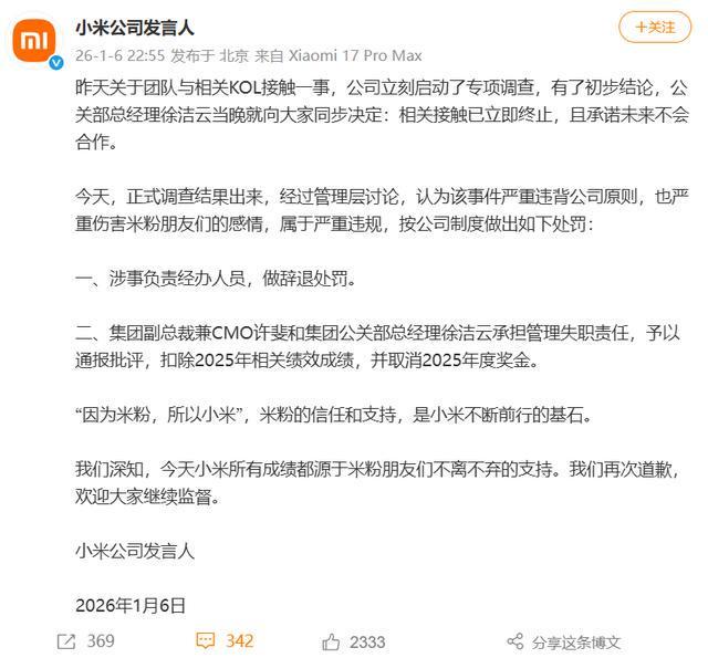 1月16日,@小米公司发言人公布了团队与相关KOL接触一事的处罚结果。全文如下: