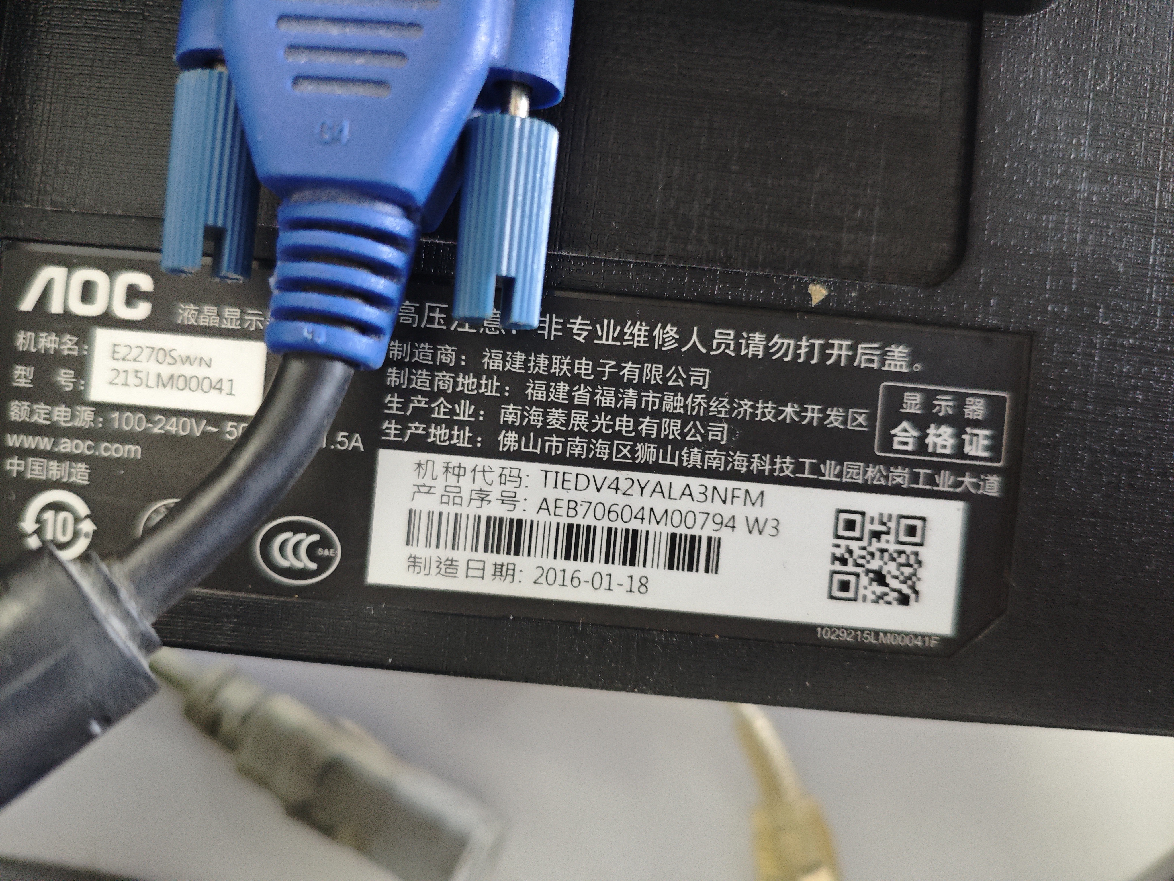 aoc的显示器21.5英寸。轻微偏红。带VGA线和电源线。60元