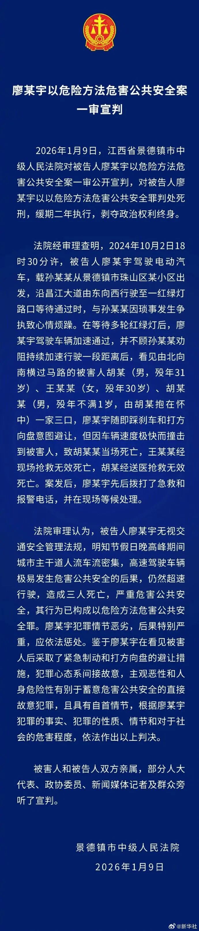 景德镇一家3口被撞身亡,一审宣判:肇事司机廖某宇被判死缓