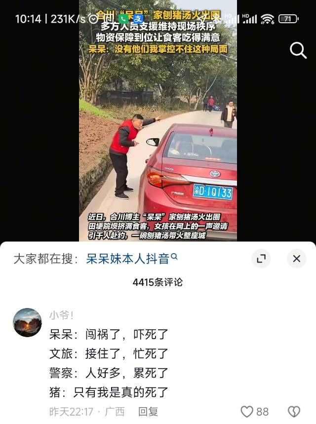 2026年1月9日凌晨,呆呆发布了一条视频称:“1月11日我家要杀两头猪,有人来帮我按猪吗?请你吃刨猪汤!年迈的老父亲年龄大了,我怕他按不过猪。没想到这条视频引发了网友的热捧,两天多的时间内,已有18万多点赞…