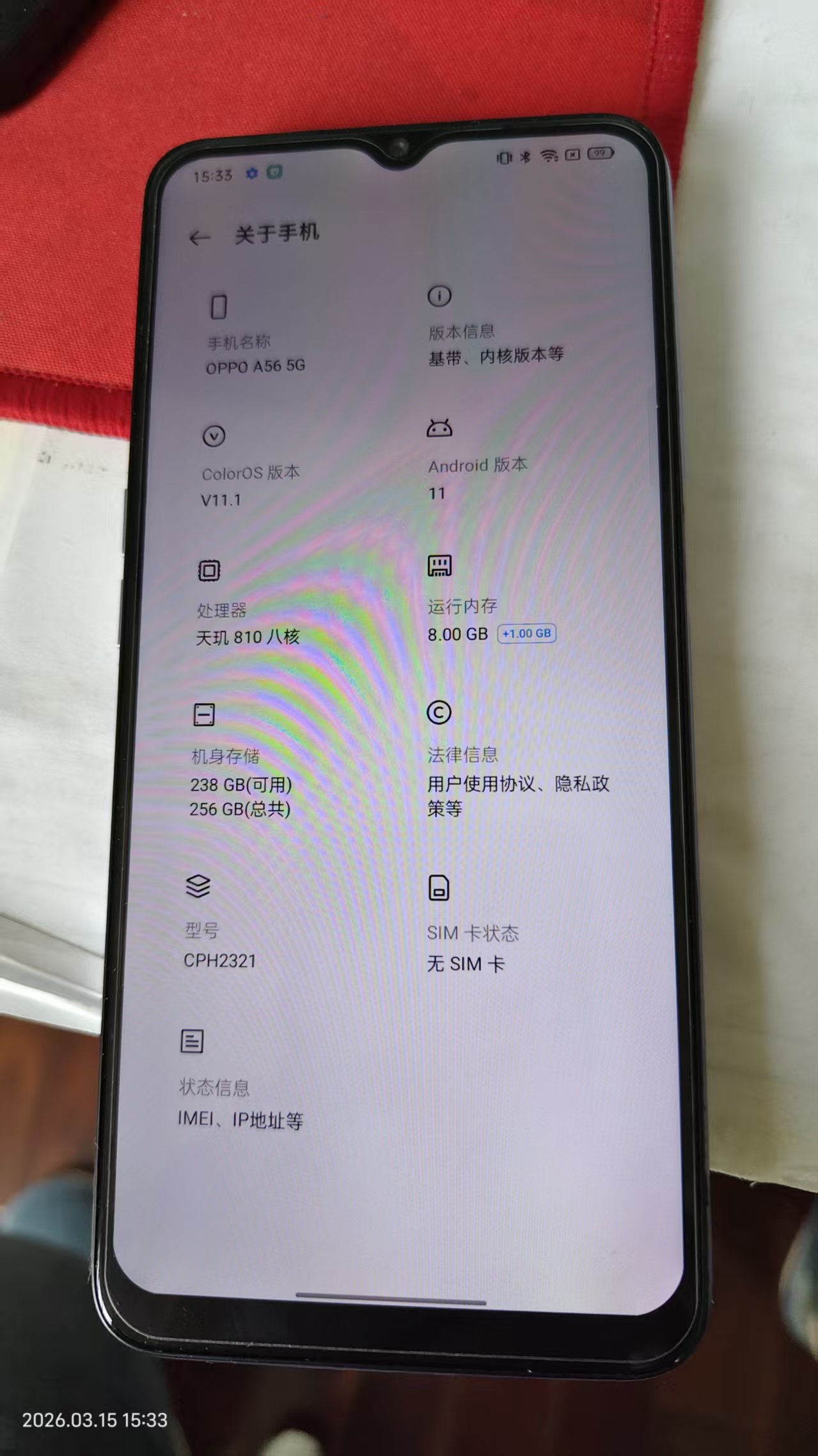 出oppo a56 8+128 230元,无良商家改成256了,实际为128,电池质量不错,待机时间长。sim卡没插过,买来在家看视频用的,有几个号APP。