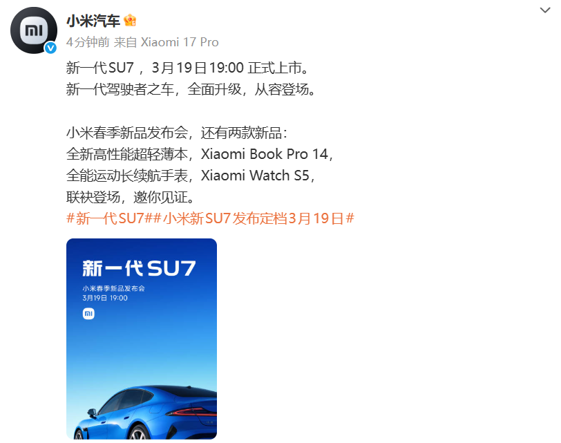 雷军官宣:新一代SU7,3月19日19:00正式上市