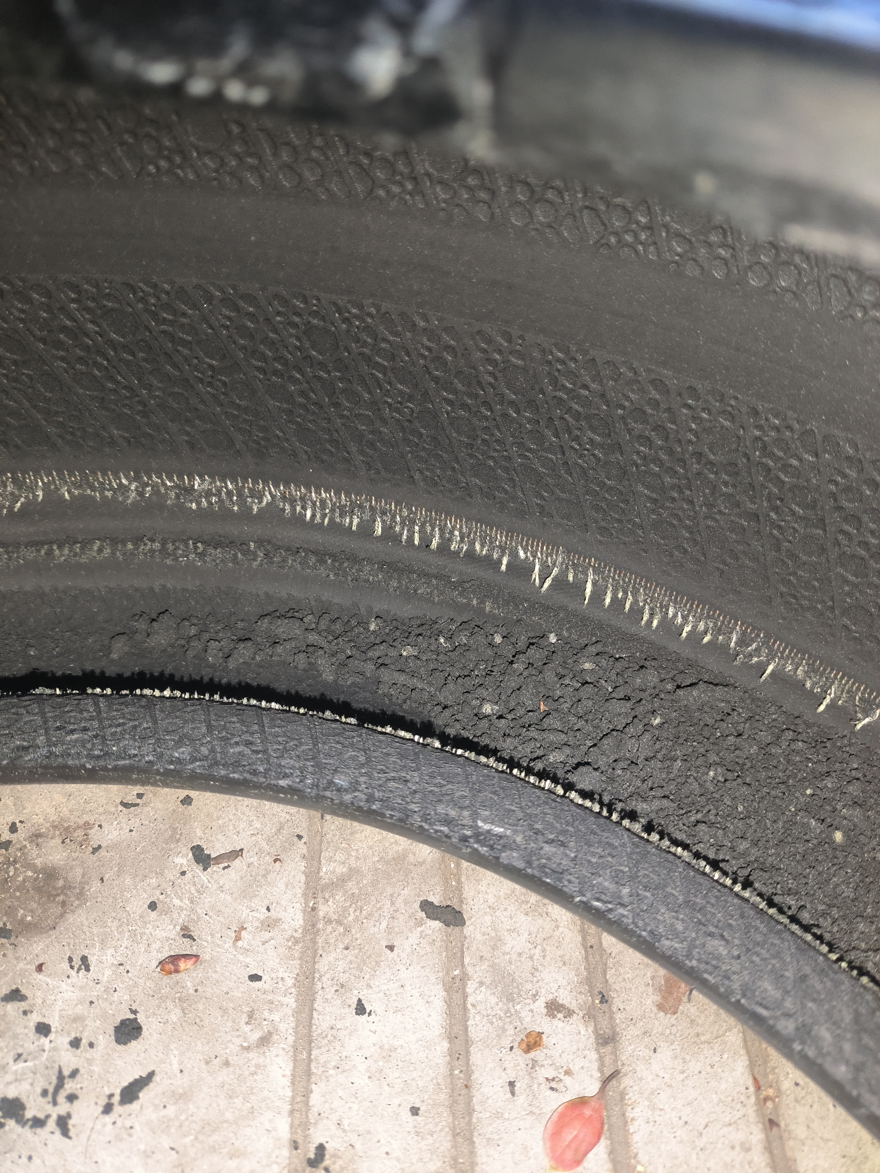 这是一条扎钉漏气后坚持开去补胎的轮胎内部,外部只有一条压痕,内部已经分经挫骨皮肉粉碎。车子还是要有备胎好点。