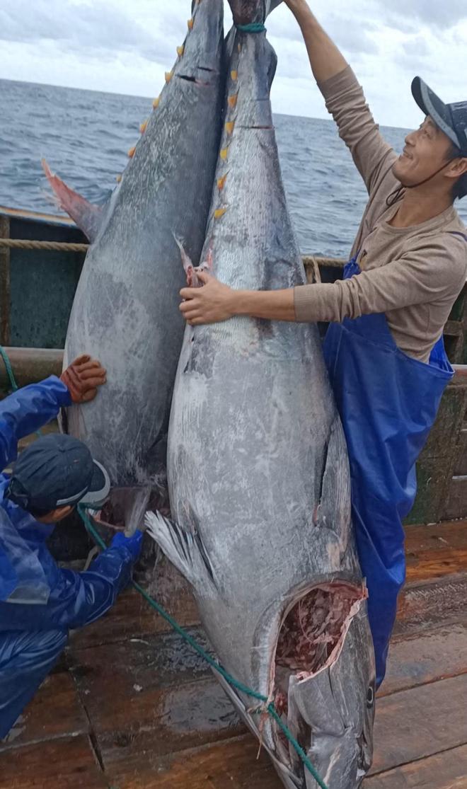 4月3日,有着30多年海洋捕捞经验的宁波奉化渔民范吉通,在东海渔区成功捕获两条重200公斤以上的野生金枪鱼。4月6日下午,两条大鱼运抵台州温岭,交由当地企业代售,业内预估总市值超10万元。