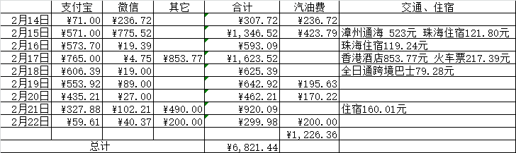 总结:我这边共消费6800元人民币,汽油费200元600公里,算下来差不多1400元